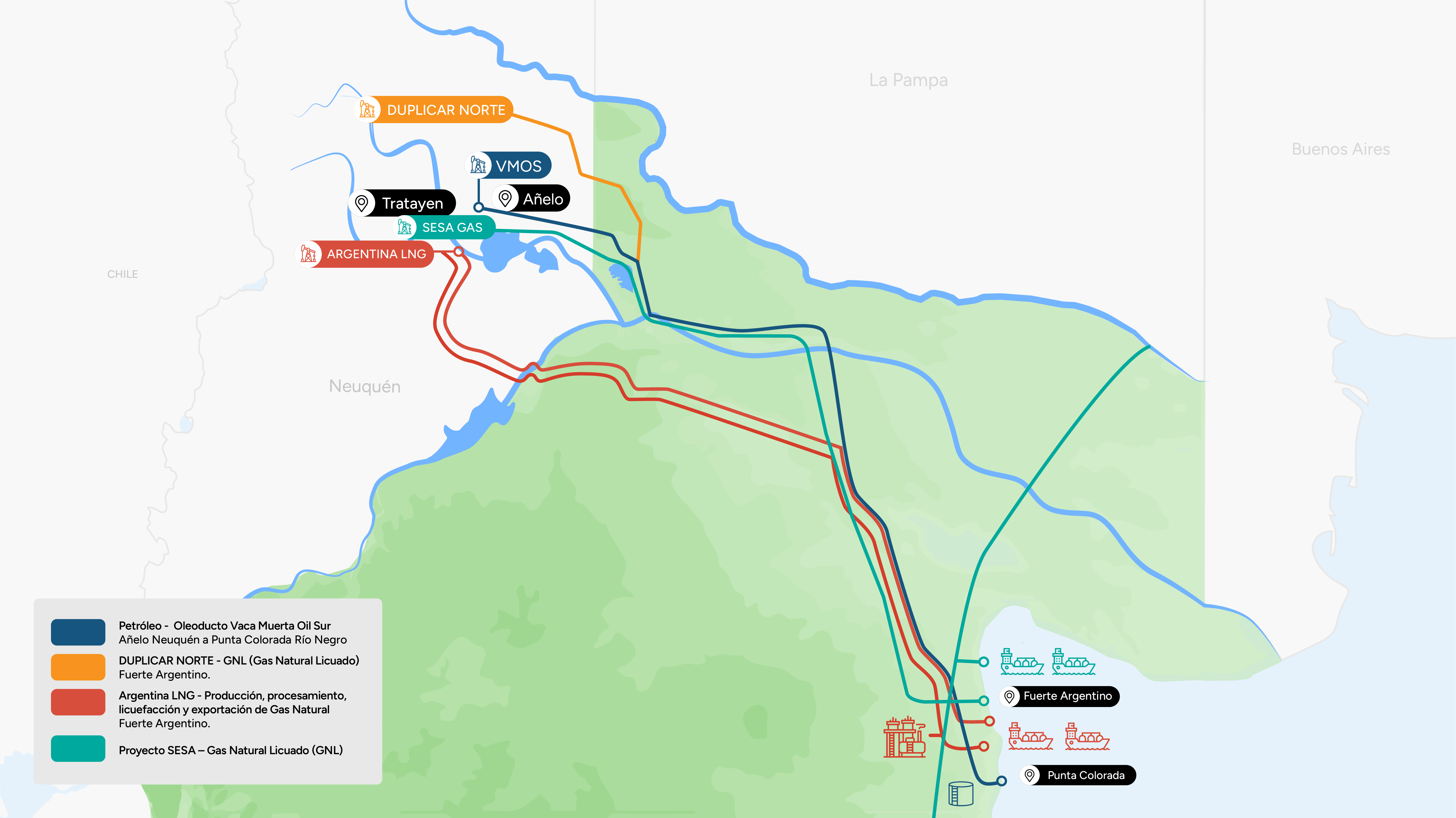 Río Negro avanza en la consolidación de un hub energético de alcance nacional e internacional a partir del desarrollo de los proyectos Vaca Muerta Oil Sur (VMOS), Argentina LNG y SESA, que en conjunto, en el marco del acuerdo estratégico con YPF y empresas asociadas, contemplan inversiones por más de USD 36.000 millones, infraestructura de gran escala y un fuerte impacto en la generación de empleo y el desarrollo productivo en todo el territorio provincial.